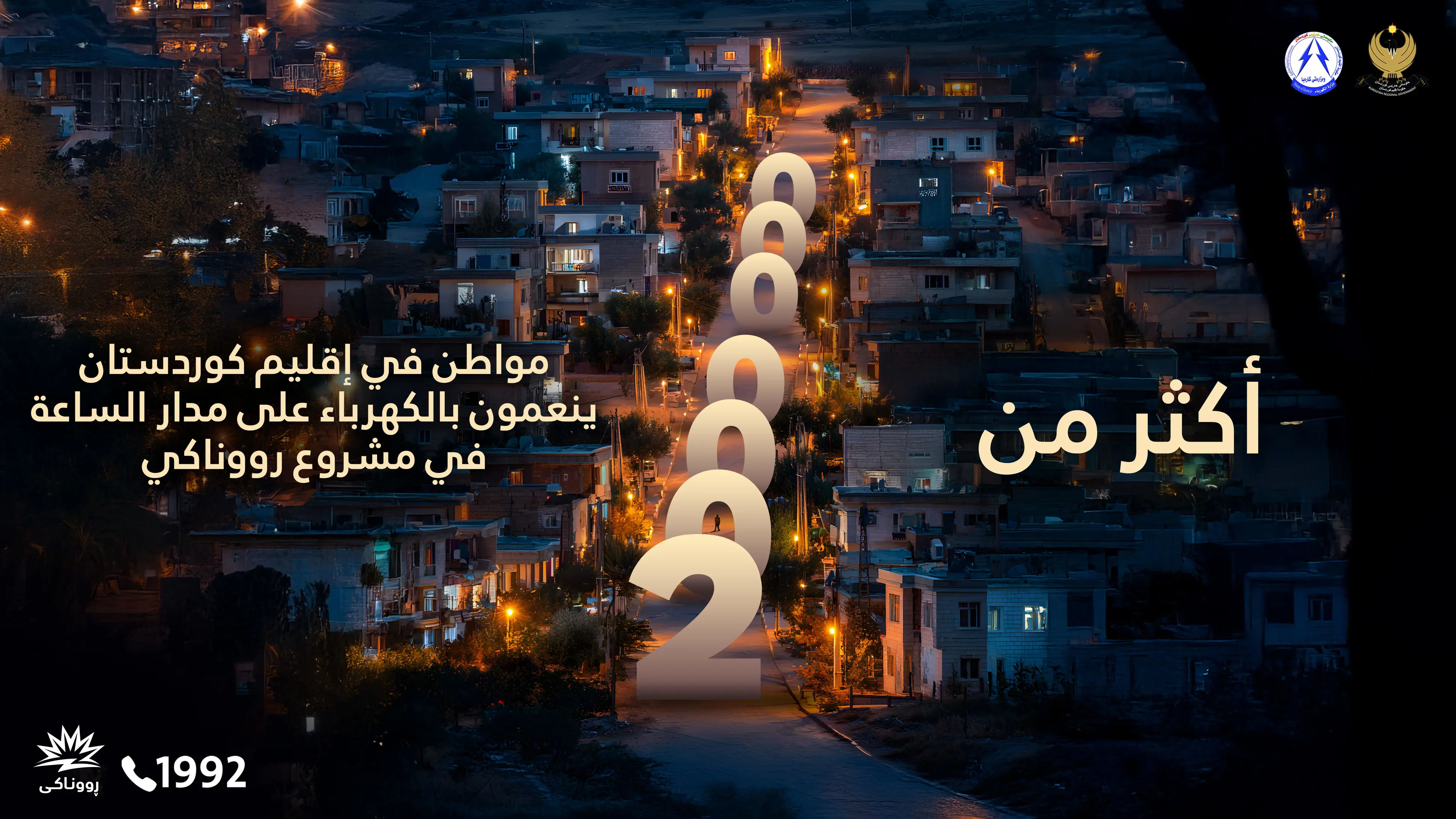 أربيل، إقليم كردستان (GOV.KRD) - يسر وزارة الكهرباء في حكومة إقليم كردستان أن تعلن اليوم أن أكثر من 2 مليون مواطن، أي ما يقارب 30% من سكان إقليم كردستان، ينعمون الآن بالكهرباء على مدار الساعة ضمن مشروع رووناكي.