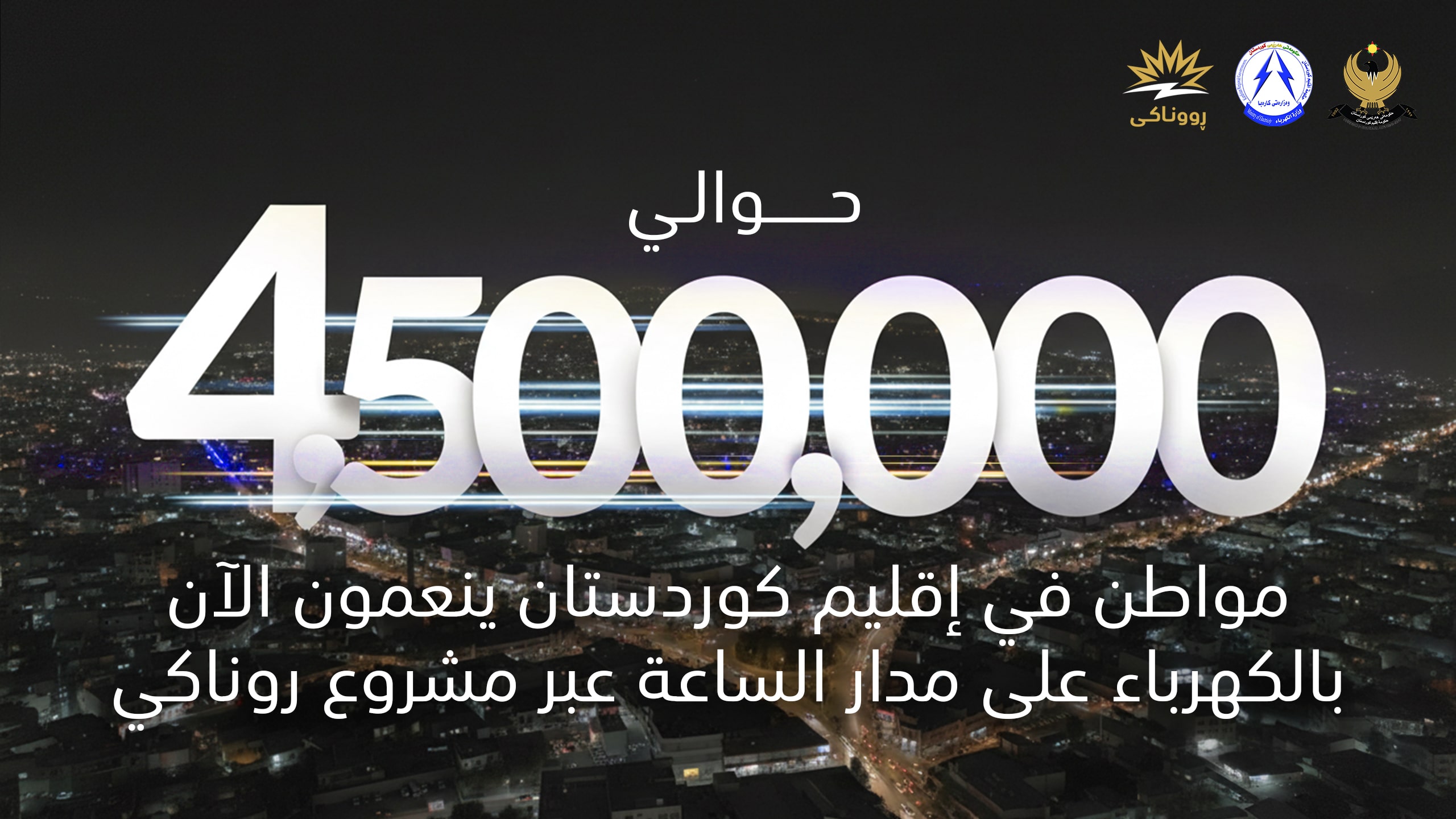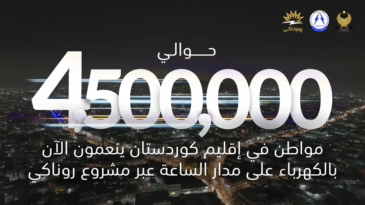 أربيل، إقليم کوردستان (GOV.KRD) - يسر وزارة الكهرباء في حكومة إقليم کوردستان أن تعلن اليوم أن حوالي 4.5 مليون مواطن، أي حوالي 70% من سكان إقليم کوردستان، ينعمون الآن بالكهرباء على مدار الساعة ضمن مشروع روناكي.