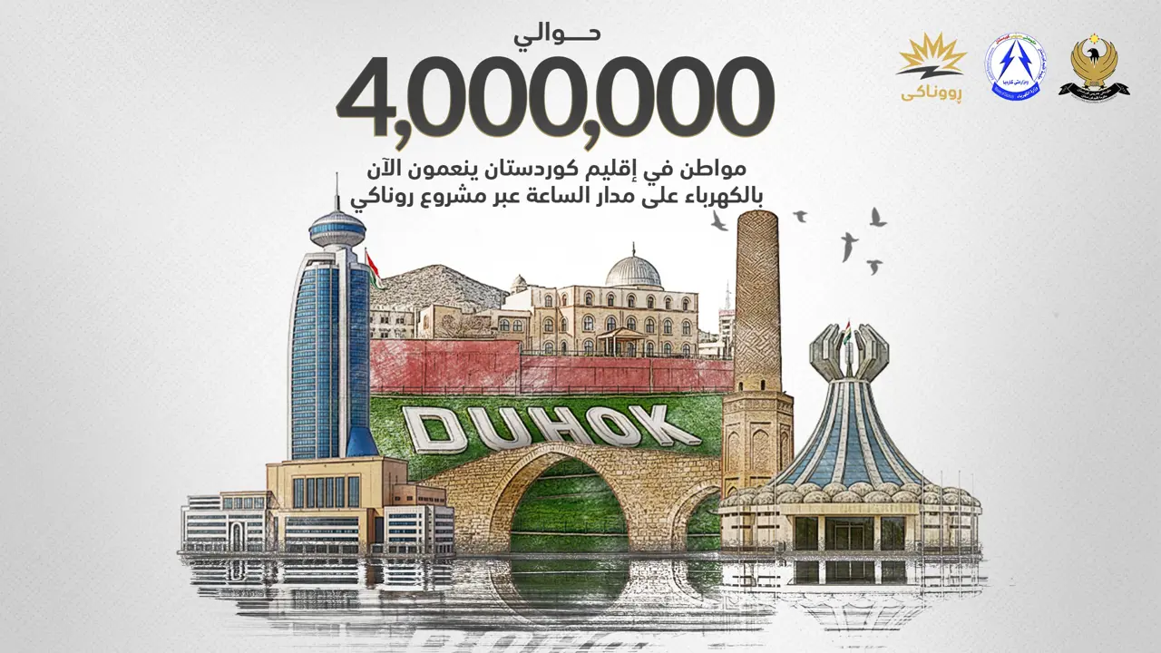 أربيل، إقليم کوردستان (GOV.KRD) - يسر وزارة الكهرباء في حكومة إقليم کوردستان أن تعلن اليوم أن حوالي 4 مليون مواطن، أي أكثر من 50% من سكان إقليم کوردستان، ينعمون الآن بالكهرباء على مدار الساعة ضمن مشروع روناكي.